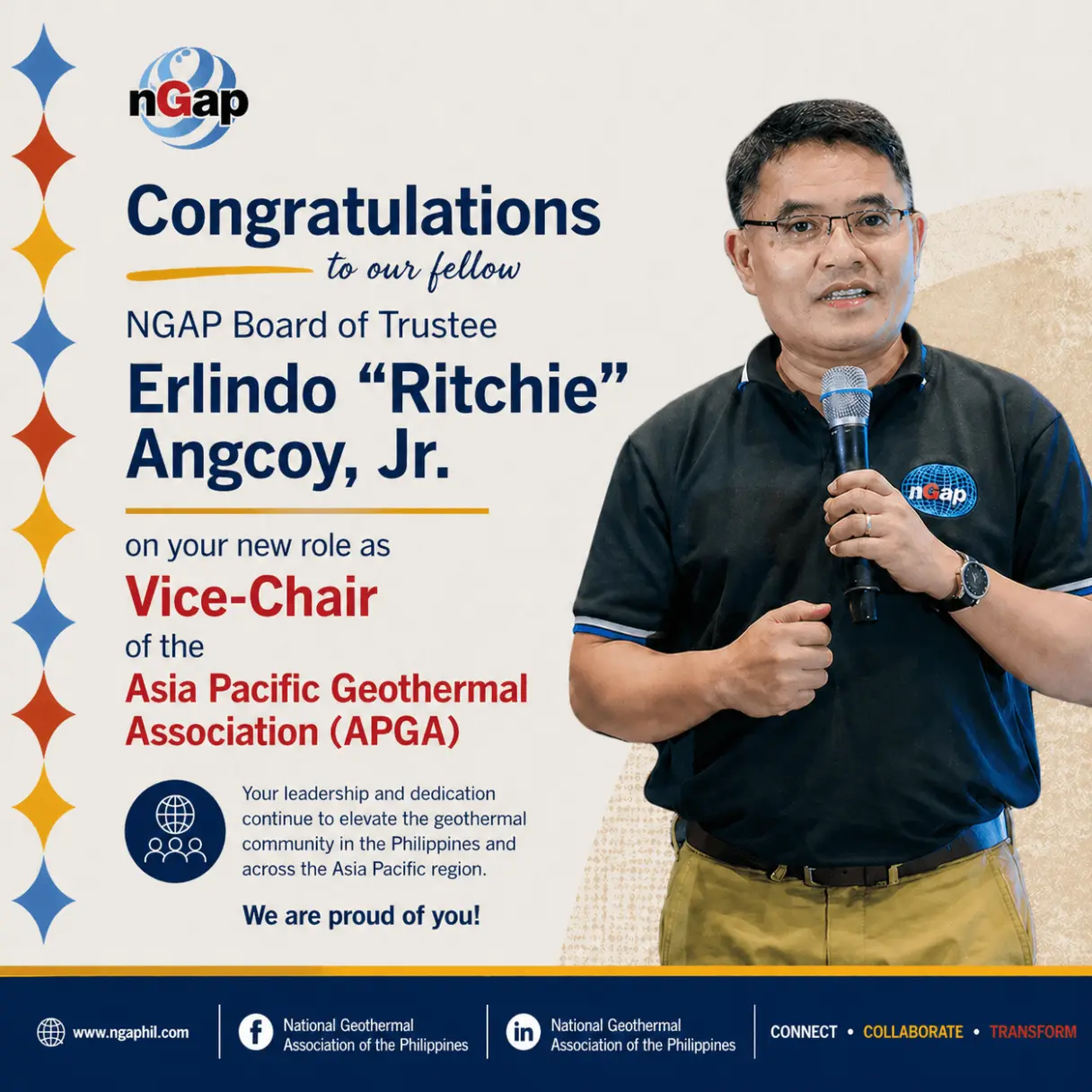 We proudly congratulate our very own Erlindo "Ritchie" Angcoy, Jr., NGAP Board of Trustee, on his appointment as Vice-Chair of the Asia Pacific Geothermal Association (APGA).